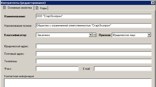 коды контрагентов.